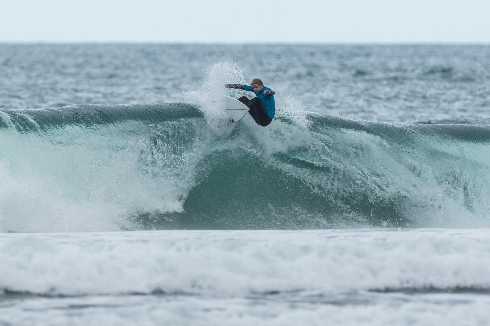 Mount Maunganui’s Sol Fritchley is being chased by a big pack of surfers in the Under 14 Boys Division. The young natural foot surfer won the first two events of the series and he will be impossible to beat should he advance to the semifinals or further.
