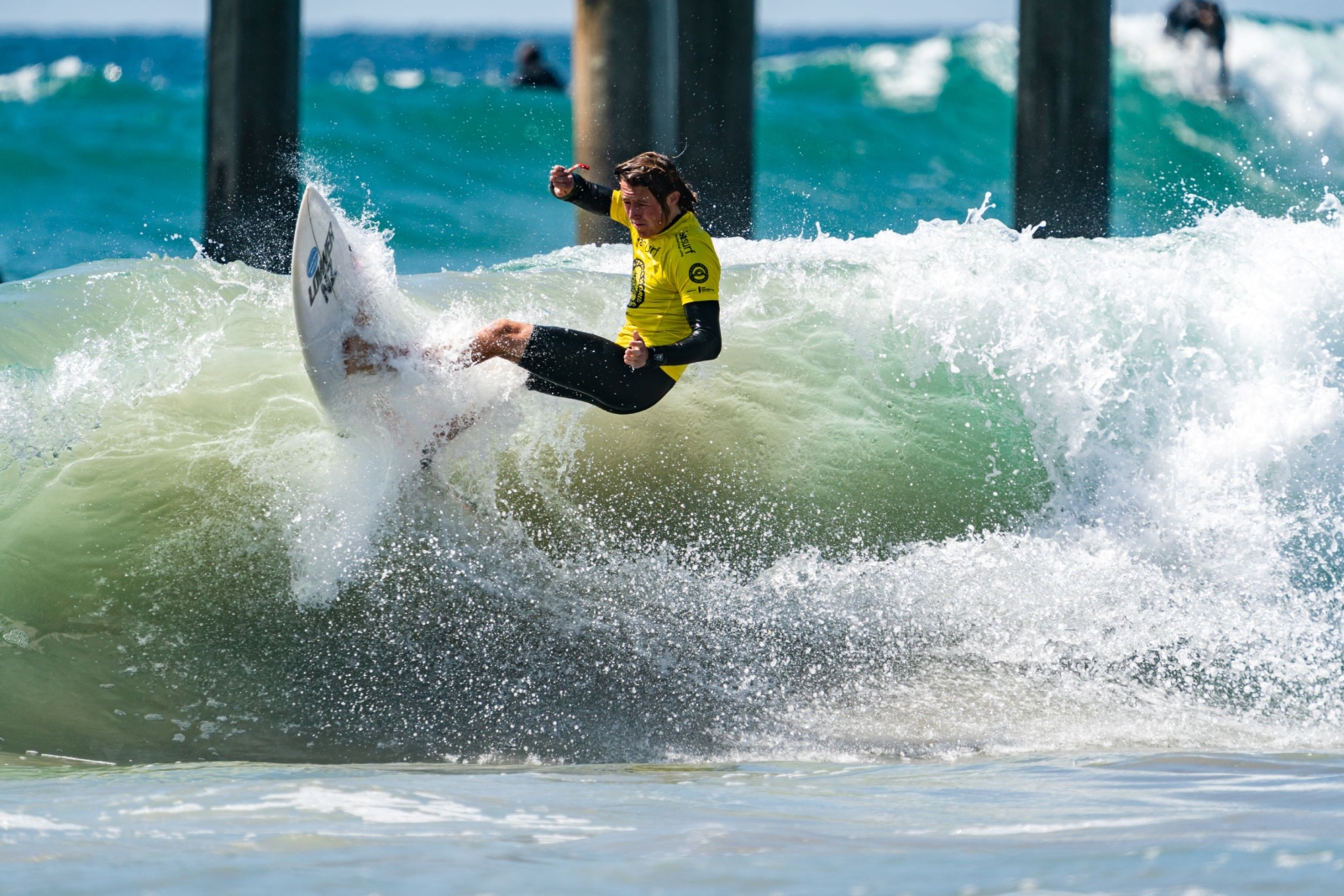 In small 1.0m waves, many surfers struggled to find waves with good scoring potential however Caleb Cutmore (Raglan) surfed to a 6.77 earning himself a second-place finish, only going down to QS Superstar Lucca Mesinas with an outstanding 16.07 heat total. “If you got the waves there was some scoring opportunity but if not, it was fading into a gutter really quickly”. “It did not offer much of a section” Caleb added of the typical Huntington Beach conditions.