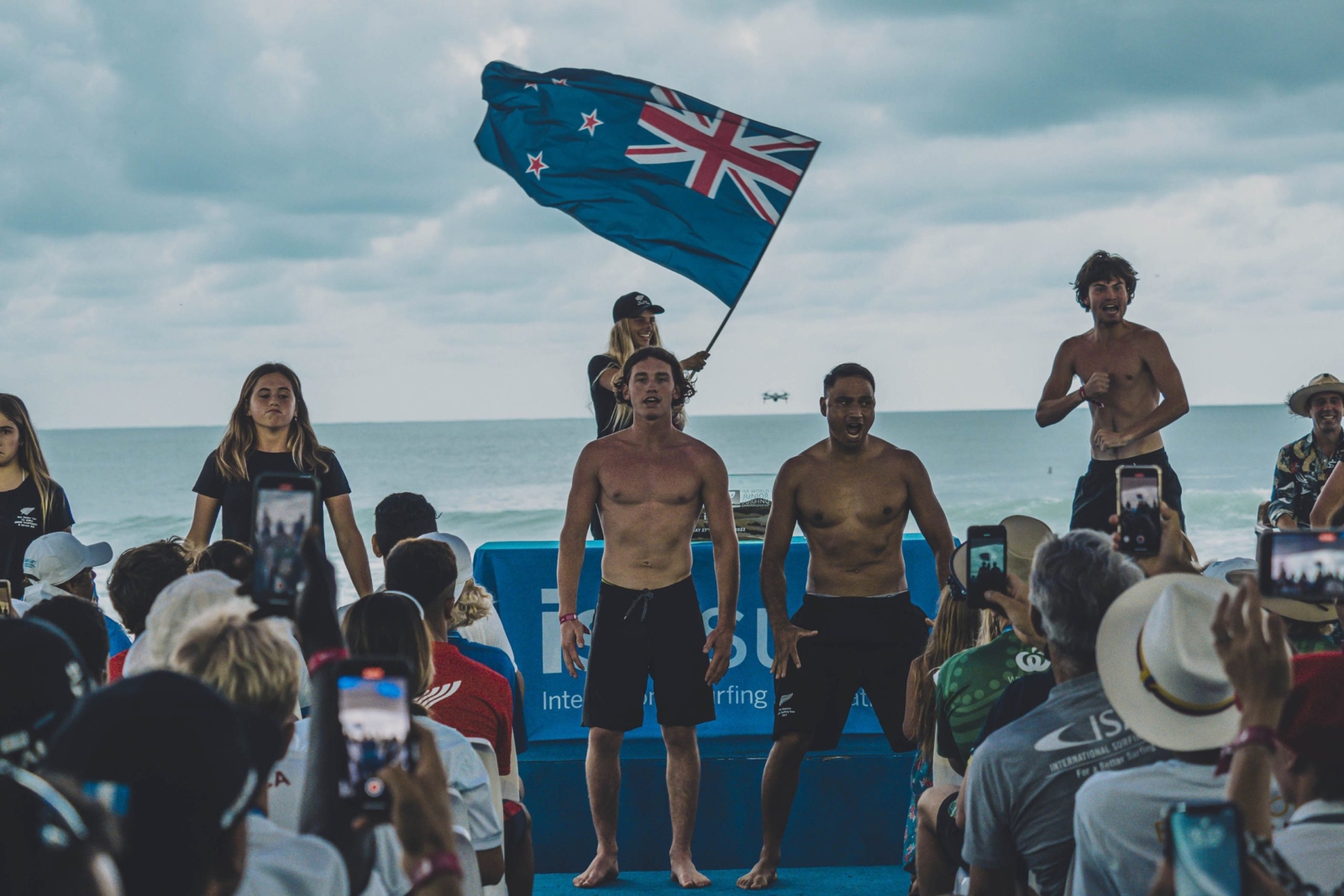 The New Zealand Junior Surfing team made up of 12 surfers from around New Zealand joined 44 other teams from around the globe for the iconic Sands of the World Ceremony. Ava Henderson (Chch) proudly flew the New Zealand flag whilst Finn Vette (Gis) poured the sand collected from Piha Beach into the transparent box,  a ceremony that symbolizes the peaceful gathering of nations of the world through surfing.
